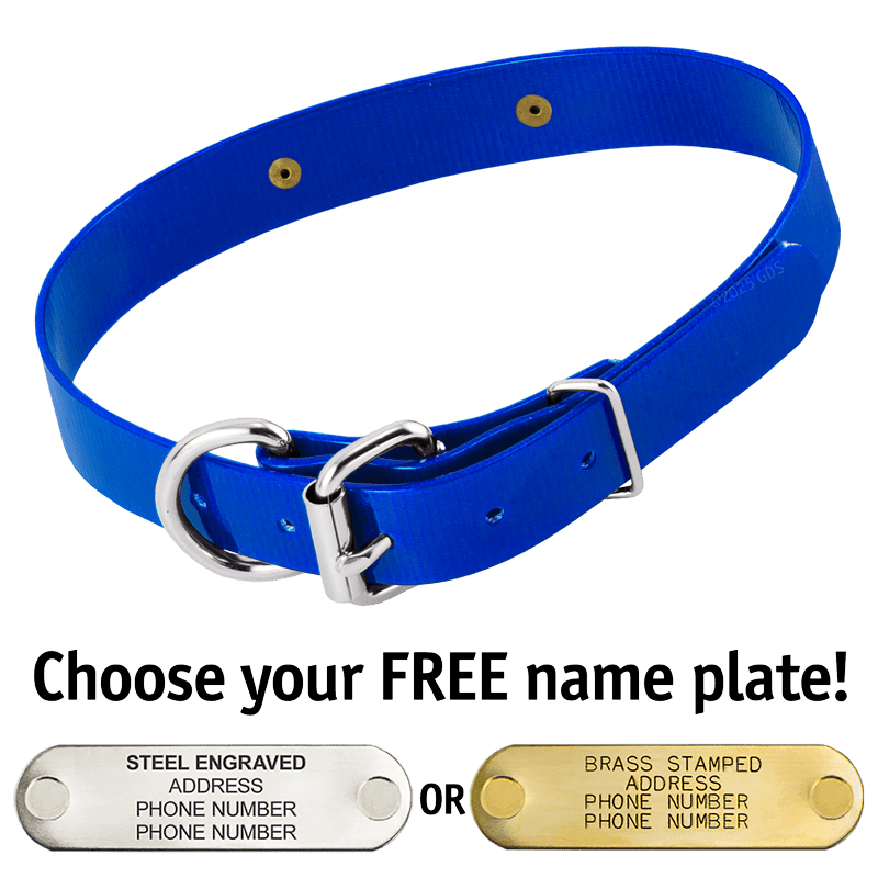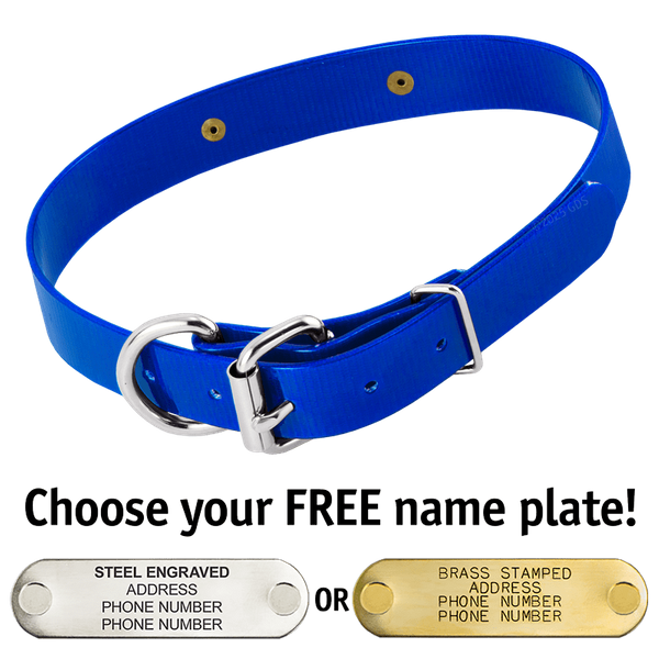 When you order this collar, you get your choice of a FREE 4-line laser-engraved stainless steel or machine-stamped brass 2.75" x .75" I.D. plate which we attach to your collar using rivets.