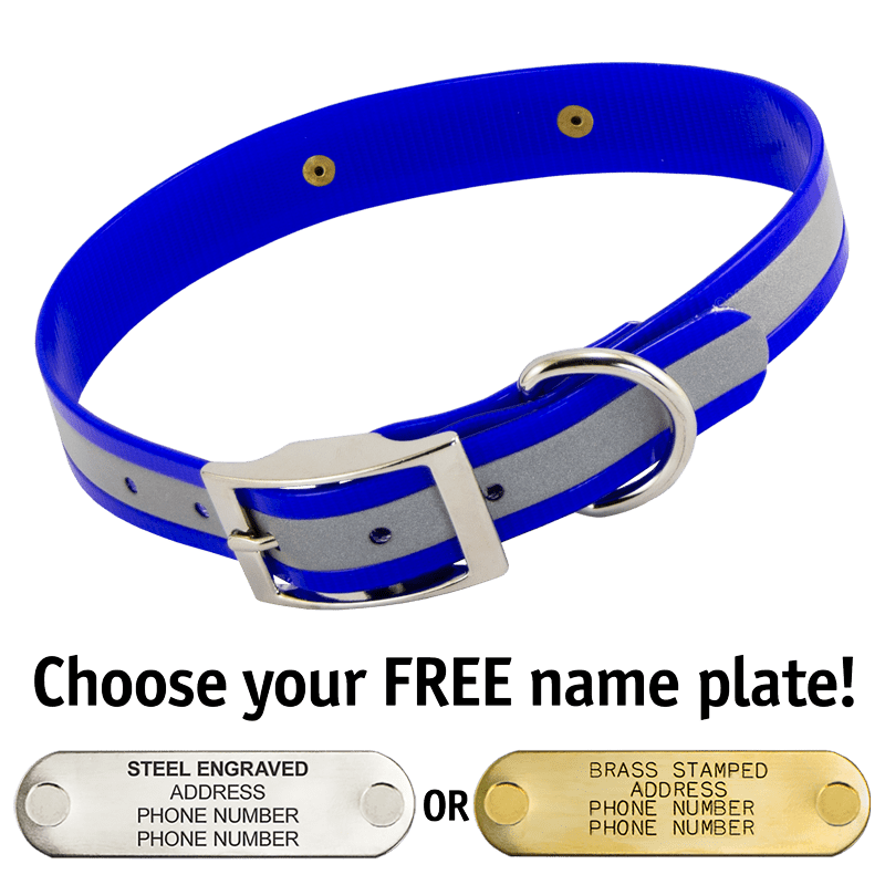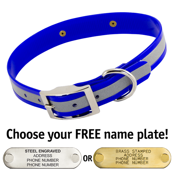 When you order this collar, you get your choice of a FREE 4-line laser-engraved stainless steel or machine-stamped brass 2.75" x .75" I.D. plate which we attach to your collar using rivets.
