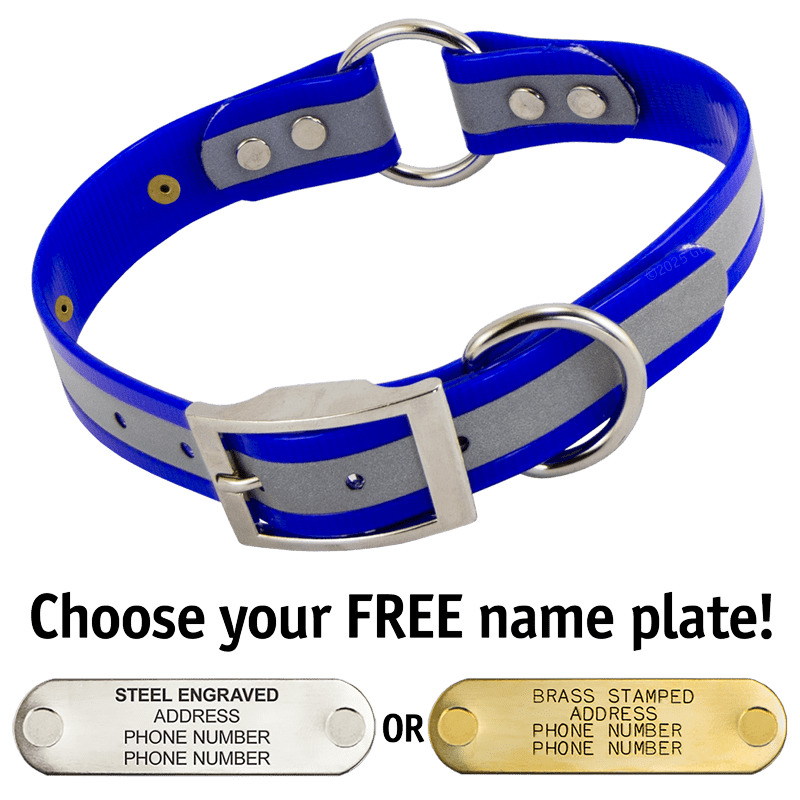 I decided to order a collar that had a stamped and riveted name plate instead of the dangly kind because the silicone ones would rip over time with wear and tear or get chewed/torn off from the dogs playing together and I like that it is one less thing dangling on a key ring from their collar clanking around especially when they hang their heads out of the window on rides. The collar is great and I love the reflective aspect. I will be ordering another one of these for one of my other dogs as well seeing as her silicone one has disappeared now too. The durability over other options simply make it a no brainer for me moving forward. Thank yall so much!