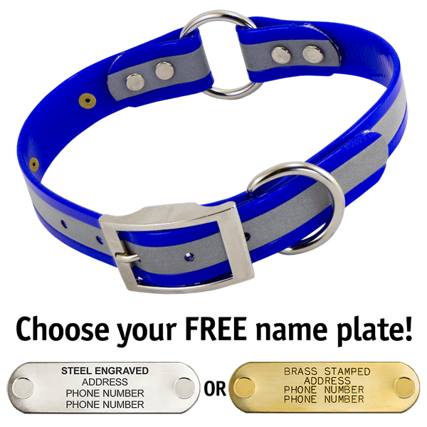 When you order this collar, you get your choice of a FREE 4-line laser-engraved stainless steel or machine-stamped brass 2.75" x .75" I.D. plate which we attach to your collar using rivets.