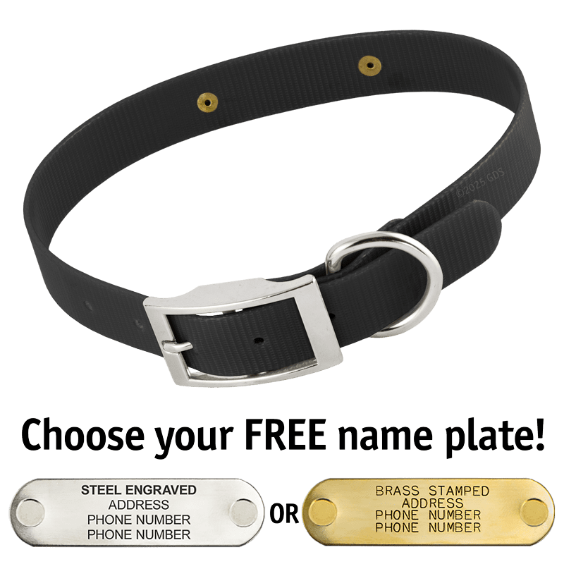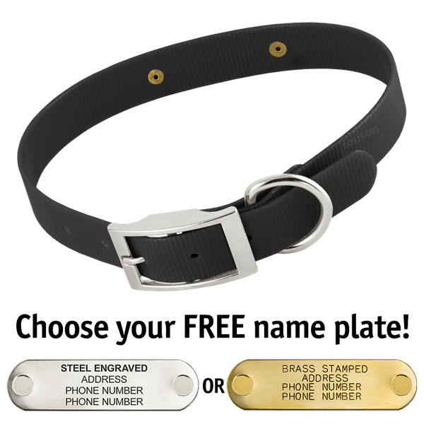 When you order this collar, you get your choice of a FREE 4-line laser-engraved stainless steel or machine-stamped brass 2.75" x .75" I.D. plate which we attach to your collar using rivets.