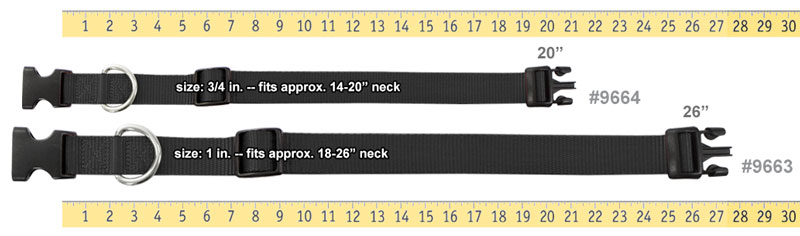 3/4" wide quick-release nylon collar adjusts to 14" - 20" neck sizes. Single-ply, adjustable heat-sealed premium nylon webbing with precision black plastic dual-action spring snap buckle.