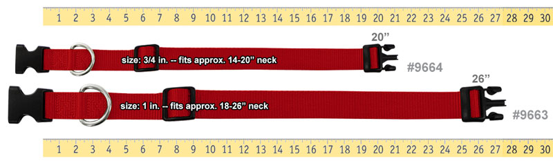 3/4" wide quick-release nylon collar adjusts to 14" - 20" neck sizes. Single-ply, adjustable heat-sealed premium nylon webbing with precision black plastic dual-action spring snap buckle.