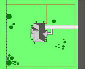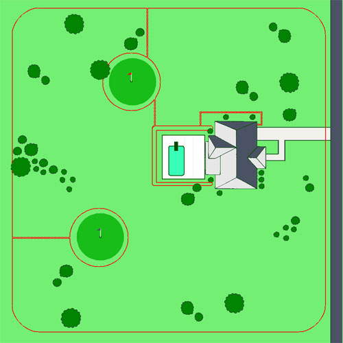 This type of boundary set up produces a double wide field and can be fit to most yards. The double loop is used to define 3 sides of the containment area and the house is used to define the fourth boundary. The 2 wires should be separated by 3-8 feet depending on your field width settings.