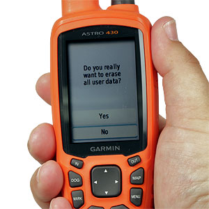 All settings, user data (waypoints, routes, tracks, and dog collars in the Dog List), and satellite data will be erased when resetting the GPS. User data can be backed up to your computer by