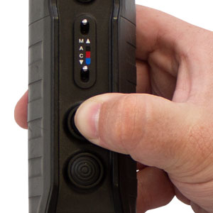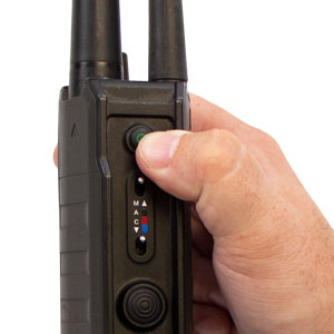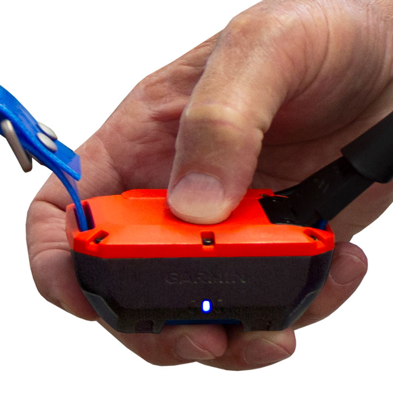 1. Hold the power button on the dog collar device until the device emits two series of beeps (about 2 seconds), and then release the power button. The status LED flashes blue. The dog collar device is now ready to be paired with a handheld.