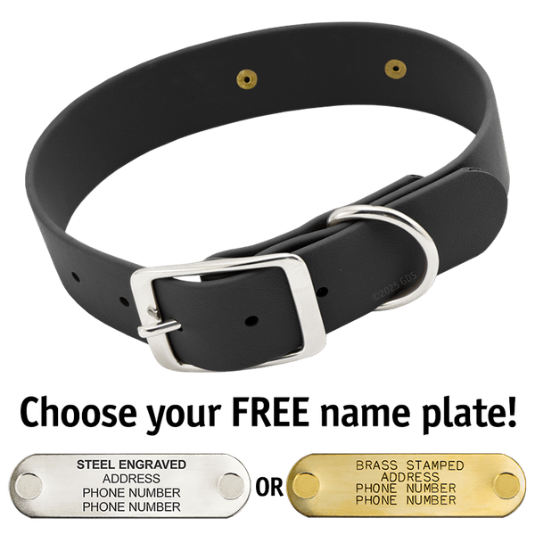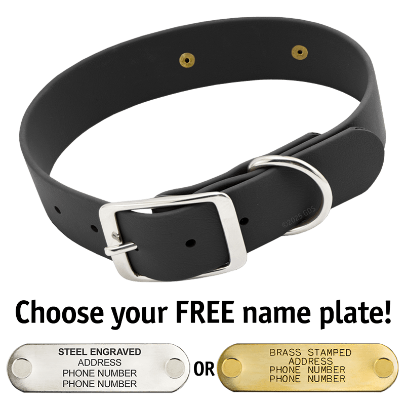 When you order this collar, you get your choice of a FREE 4-line laser-engraved stainless steel or machine-stamped brass 2.75" x .75" I.D. plate which we attach to your collar using rivets.
