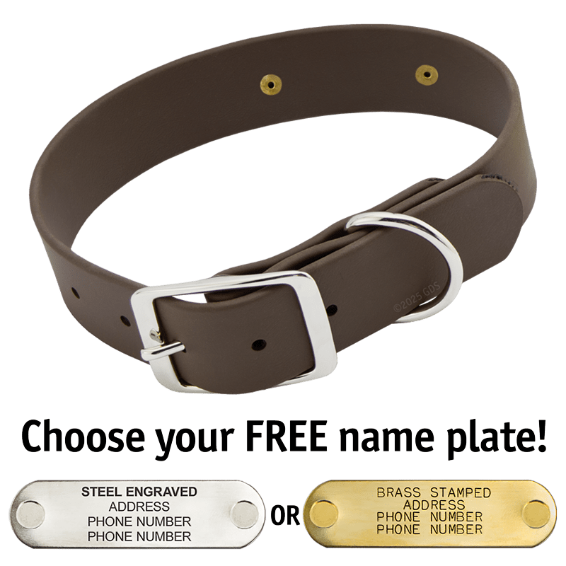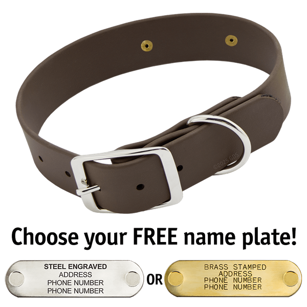 When you order this collar, you get your choice of a FREE 4-line laser-engraved stainless steel or machine-stamped brass 2.75" x .75" I.D. plate which we attach to your collar using rivets.