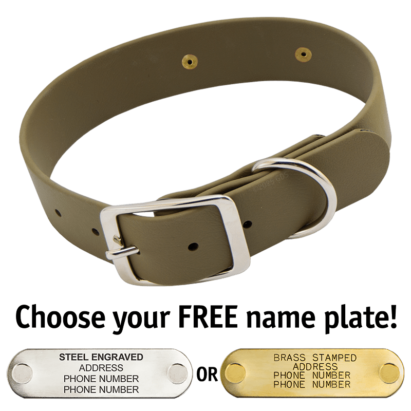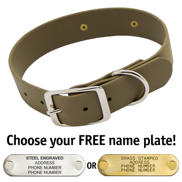 When you order this collar, you get your choice of a FREE 4-line laser-engraved stainless steel or machine-stamped brass 2.75" x .75" I.D. plate which we attach to your collar using rivets.
