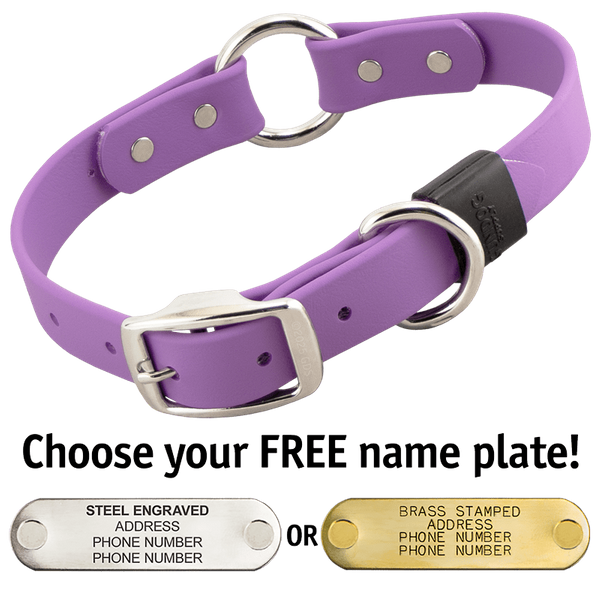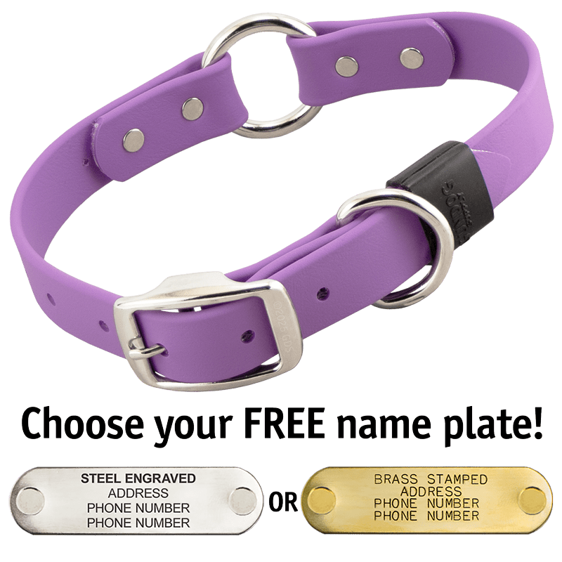 When you order this collar, you get your choice of a FREE 4-line laser-engraved stainless steel or machine-stamped brass 2.75" x .75" I.D. plate which we attach to your collar using rivets.