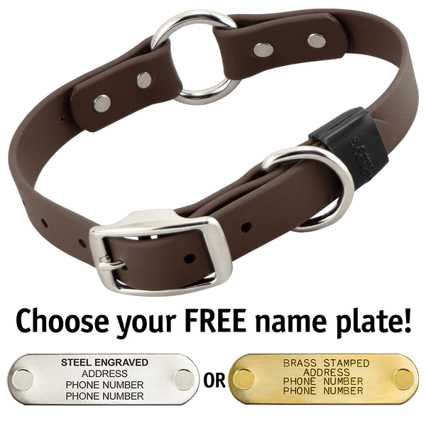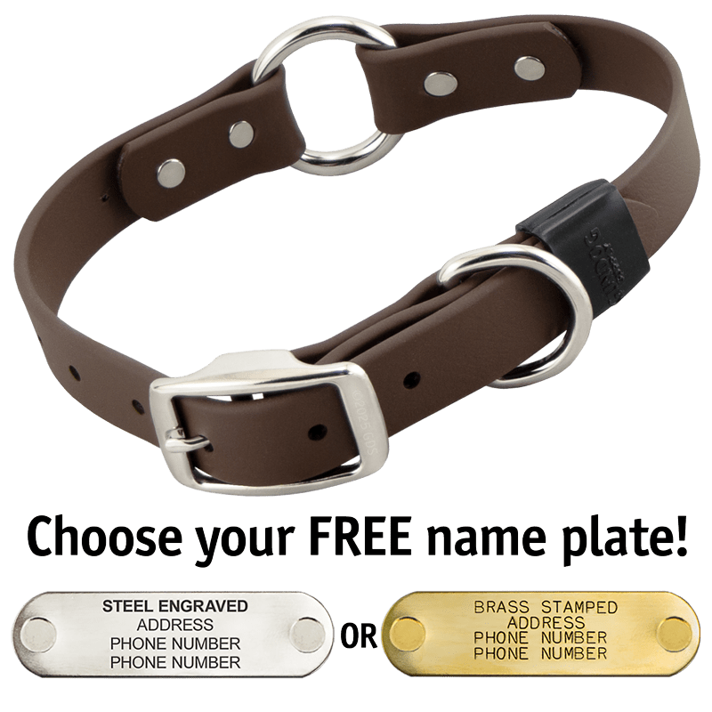 When you order this collar, you get your choice of a FREE 4-line laser-engraved stainless steel or machine-stamped brass 2.75" x .75" I.D. plate which we attach to your collar using rivets.