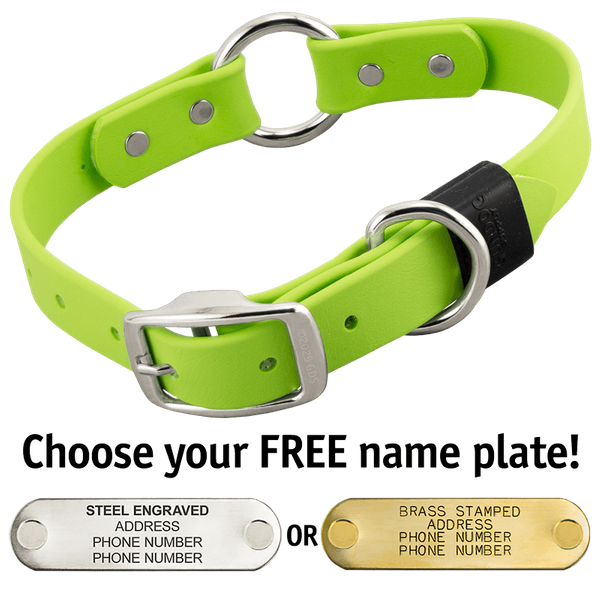 When you order this collar, you get your choice of a FREE 4-line laser-engraved stainless steel or machine-stamped brass 2.75" x .75" I.D. plate which we attach to your collar using rivets.