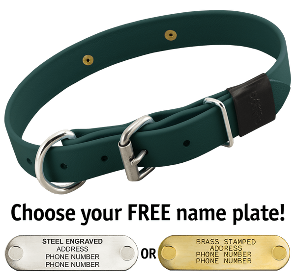 When you order this collar, you get your choice of a FREE 4-line laser-engraved stainless steel or machine-stamped brass 2.75" x .75" I.D. plate which we attach to your collar using rivets.