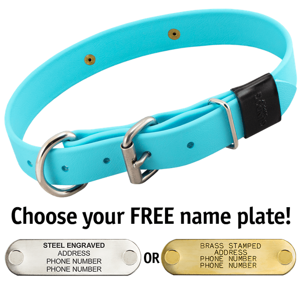 When you order this collar, you get a FREE 2.75" x .75" 3 or 4 line machine-stamped brass I.D. plate which we attach to your collar using rivets.