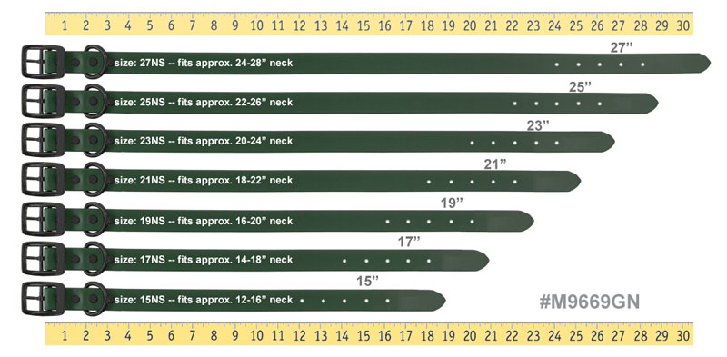 I sure wish you could give a simple inch length of these collars and not merely an "in-house " measuerment of "19NL" or whatever it is.Both of the collars I ordered are too short, though me neck meaasurement aligns with your system of sizing. A simple inch length would have prevented this.In five years when I get a puppy, I sure hope I can find these...and that I give the pup the same name.