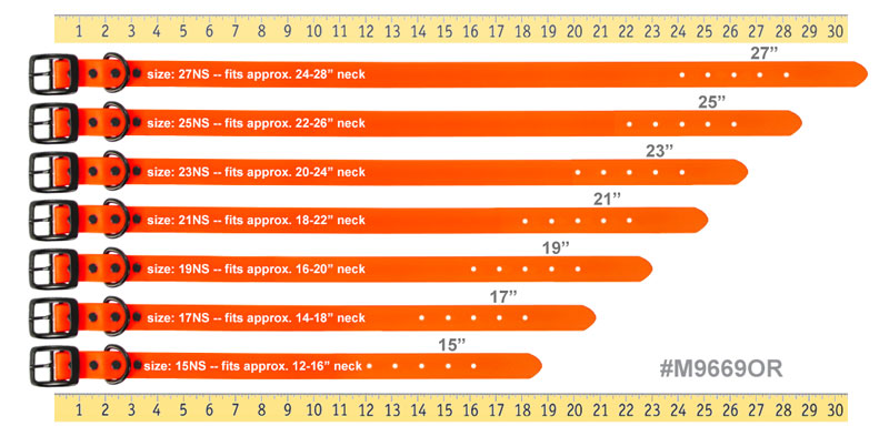 I sure wish you could give a simple inch length of these collars and not merely an "in-house " measuerment of "19NL" or whatever it is.Both of the collars I ordered are too short, though me neck meaasurement aligns with your system of sizing. A simple inch length would have prevented this.In five years when I get a puppy, I sure hope I can find these...and that I give the pup the same name.