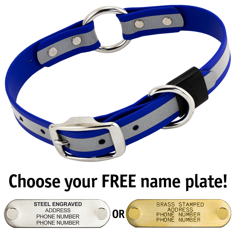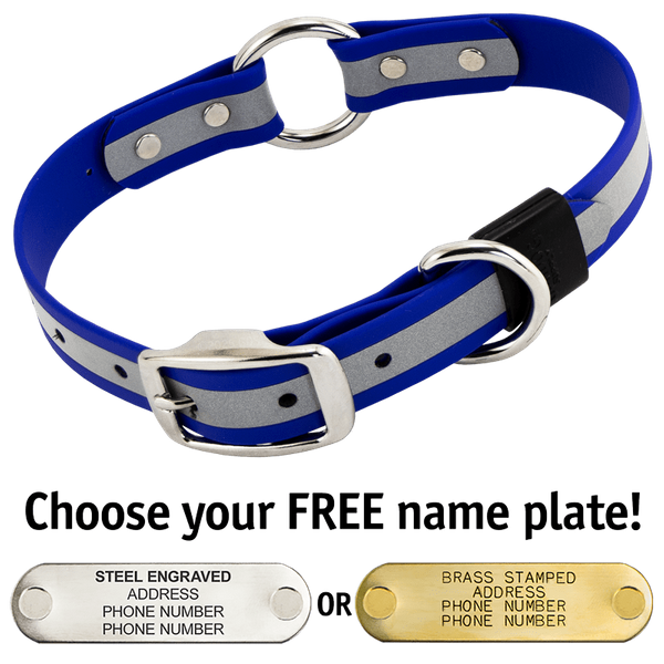 When you order this collar, you get your choice of a FREE 4-line laser-engraved stainless steel or machine-stamped brass 2.75" x .75" I.D. plate which we attach to your collar using rivets.