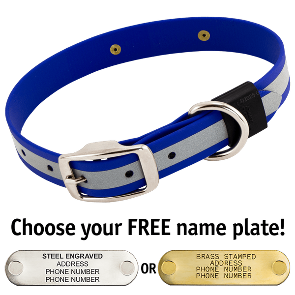 When you order this collar, you get your choice of a FREE 4-line laser-engraved stainless steel or machine-stamped brass 2.75" x .75" I.D. plate which we attach to your collar using rivets.