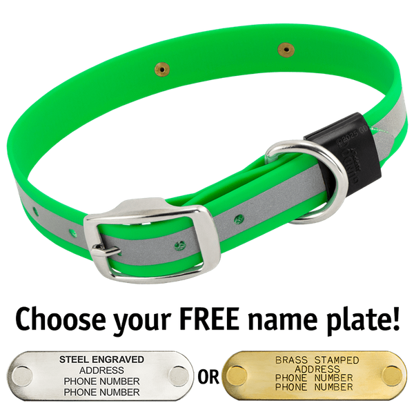 I have ordered a number of these collars over the years with all of my hunting retrievers. Often multiple collars for different uses (i.e. at home, upland and waterfowl hunting). They are durable and the nameplate with contact info is very reassuring. I especially like the reflective collar (for home) as it is very visible in the dark when hit with car lights or a flashlight...