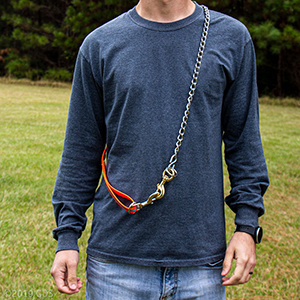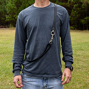 Put the lead over your shoulder and across your body and connect the snap to the end ring, second snap, or floating ring.