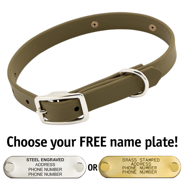 This is my 3rd Collar purchase from Gun Dog Supply. All 3 have been for my Grand Dogs! This one is for my Dainty GSP. (well, she's a petite GSP, BUT, She's HUGE when it comes to GO!!!) The Green Biothane collar matches her Brittany Brothers, just the 3/4" version instead. The collars are well made of quality materials, easy to clean and don't pick up smell (that's a huge benefit). The Laser engraved Brass Tag Looks GREAT!!! Always a Positive Experience with GDS!!!