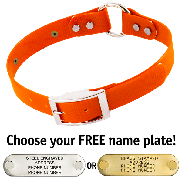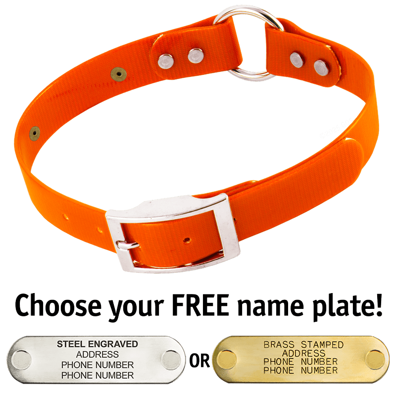 When you order this collar, you get your choice of a FREE 4-line laser-engraved stainless steel or machine-stamped brass 2.75" x .75" I.D. plate which we attach to your collar using rivets.