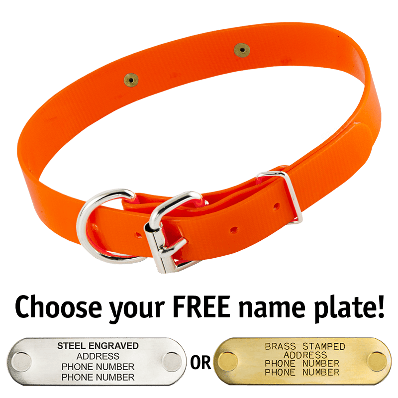 When you order this collar, you get your choice of a FREE 4-line laser-engraved stainless steel or machine-stamped brass 2.75" x .75" I.D. plate which we attach to your collar using rivets.