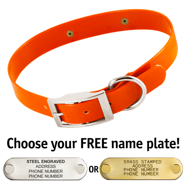 When you order this collar, you get your choice of a FREE 4-line laser-engraved stainless steel or machine-stamped brass 2.75" x .75" I.D. plate which we attach to your collar using rivets.