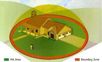 provides the safest, simplest form of pet containment ever. You plug in a transmitter somewhere inconspicuously in your home, and it emits a radio signal around your house. Your pet wears a lightweight receiver collar which listens for the signal. While it's receiving the signal, your dog is free to run and play. When the collar approaches the boundary of the signal area, it gives your dog a warning beep.