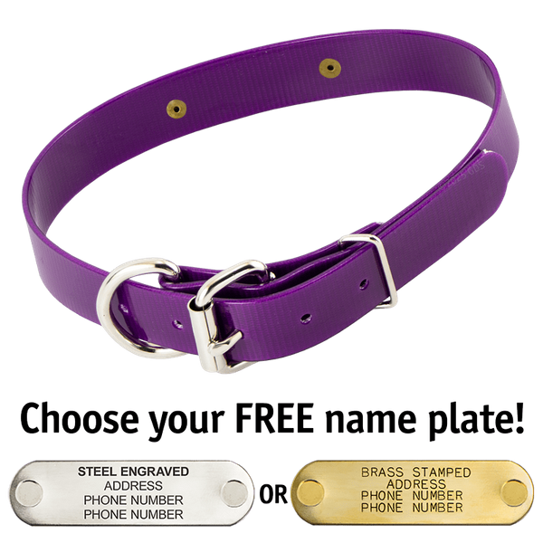 When you order this collar, you get your choice of a FREE 4-line laser-engraved stainless steel or machine-stamped brass 2.75" x .75" I.D. plate which we attach to your collar using rivets.