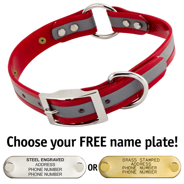 I decided to order a collar that had a stamped and riveted name plate instead of the dangly kind because the silicone ones would rip over time with wear and tear or get chewed/torn off from the dogs playing together and I like that it is one less thing dangling on a key ring from their collar clanking around especially when they hang their heads out of the window on rides. The collar is great and I love the reflective aspect. I will be ordering another one of these for one of my other dogs as well seeing as her silicone one has disappeared now too. The durability over other options simply make it a no brainer for me moving forward. Thank yall so much!