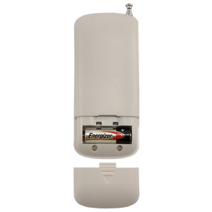 1. The remote transmitter is shipped without the battery installed and is not programmed to the receiver. Open the back cover of the remote and install the 23A battery and ensure that the (-) negative side is in contact with the spring and replace the cover. When the red button is pressed the red light will illuminate to show a signal is being sent to the receiver.