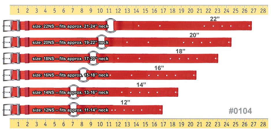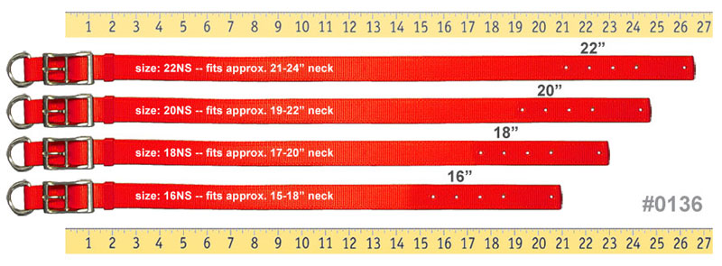 CLOSEOUT -- 1 in. Field-Grade Treated Nylon Center-Ring Dog Collar-- CUT 03-13-2023These orange nylon dog collars are treated double-ply 1" wide nylon with heavy gauge welded nickel plated rings, a nickel plated flat profile K-9 buckle, and a "floating" plastic keeper to keep the billet end of the collar tucked in. The treated nylon provides more abrasion and water resistance and therefore, a longer useful collar life than untreated nylon collars. Burnt orange color holds up well in sunlight unlike "hot" orange. Made in the USA. These collars are PRE-PUNCHED by the manufacturer for ID Plates. COLLAR SIZING MADE EASYThese are NECK SIZE COLLARS which means the dog's measured neck size IS the collar size.Measure Your Dog's Neck to ensure a proper fit.