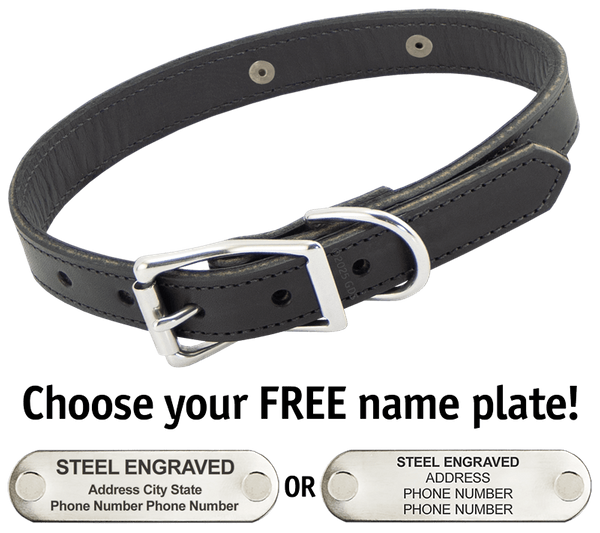 When you order this collar, you get a 3-line or 4-line laser-engraved 2.75" x .75" steel I.D. plate for FREE which we attach to your collar using rivets.