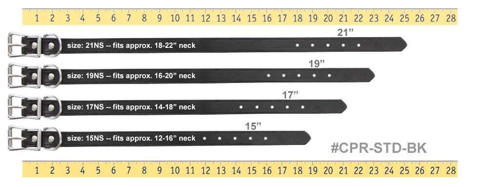 BLACK "The Roxy" Premium 2-Ply Leather Standard Dog CollarThe Roxy premium leather dog collar features an English Bridle Leather finish, which makes this collar more pliable and gives it a consistent color. English Bridle Leather is a drier tannage for a much nicer, non-oily feel. Stainless steel hardware includes a square roller buckle and dee ring, with Chicago screws instead of rivets. Average 6 lock stitches per inch. COLLAR SIZING MADE EASYThese are NECK SIZE COLLARS which means the dog's measured neck size IS the collar size.Measure Your Dog's Neck to ensure a proper fit.