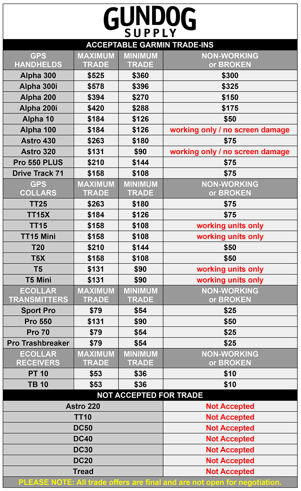 Got an old Garmin collar or handheld collecting dust? Whether it still works or not, we'll give you store credit for your eligible Garmin gear toward new purchases at Gun Dog Supply.