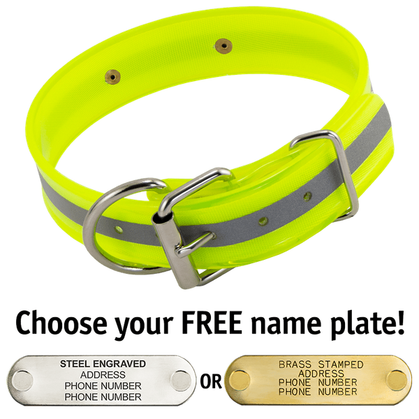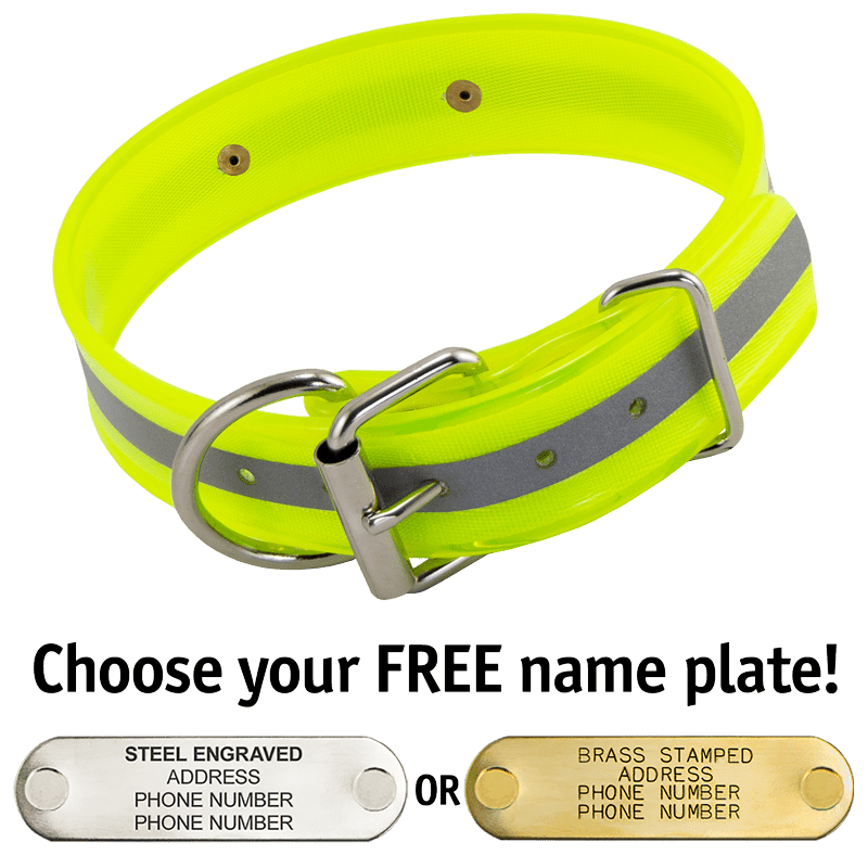When you order this collar, you get your choice of a FREE 4-line laser-engraved stainless steel or machine-stamped brass 2.75" x .75" I.D. plate which we attach to your collar using rivets.