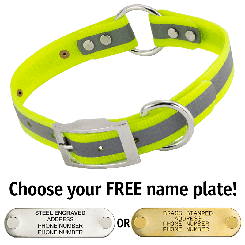 When you order this collar, you get your choice of a FREE 4-line laser-engraved stainless steel or machine-stamped brass 2.75" x .75" I.D. plate which we attach to your collar using rivets.
