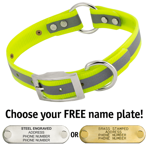 I decided to order a collar that had a stamped and riveted name plate instead of the dangly kind because the silicone ones would rip over time with wear and tear or get chewed/torn off from the dogs playing together and I like that it is one less thing dangling on a key ring from their collar clanking around especially when they hang their heads out of the window on rides. The collar is great and I love the reflective aspect. I will be ordering another one of these for one of my other dogs as well seeing as her silicone one has disappeared now too. The durability over other options simply make it a no brainer for me moving forward. Thank yall so much!
