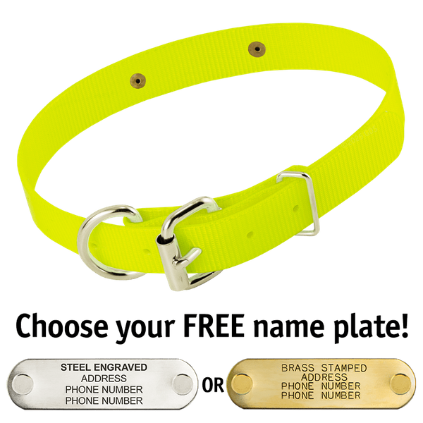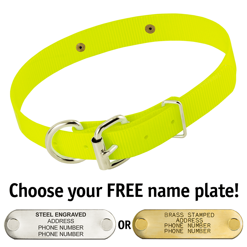 When you order this collar, you get your choice of a FREE 4-line laser-engraved stainless steel or machine-stamped brass 2.75" x .75" I.D. plate which we attach to your collar using rivets.